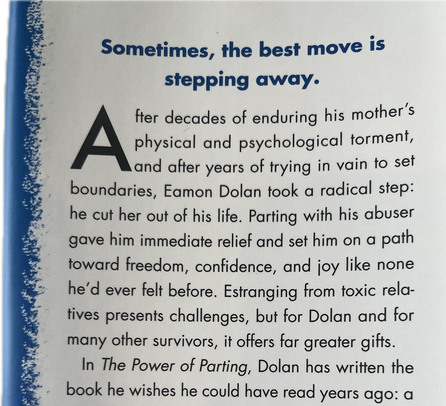 The Power of Parting by Eamon Dolan was just released April 1. Dolan is not a therapist, researcher, or a journalist. He’s a book editor. He’s also the survivor of physical, verbal, emotional, and psychological child abuse at the hands of his mother. In adulthood, he chose estrangement from her and immediately, his life improved. When she died he hadn’t spoken to her for years, and he had no regrets about the estrangement.
